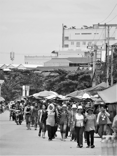 Workers typically get a quick break for lunch and crowds of women will surround vendors like this one, snatching up her prepared lunch fare for a few thousand riels. Workers will also sometimes buy prepared breakfasts and dinners from vendors too.